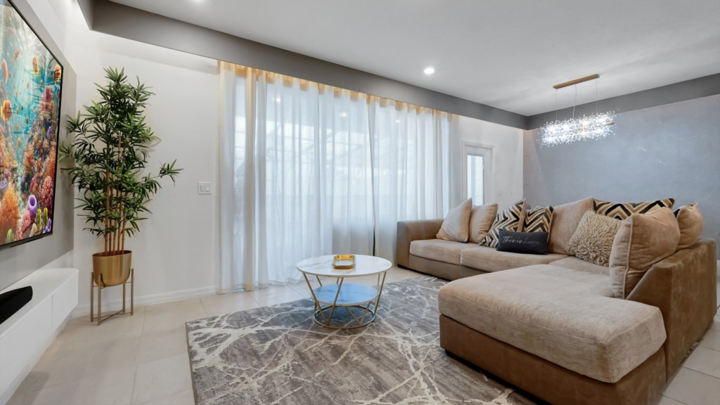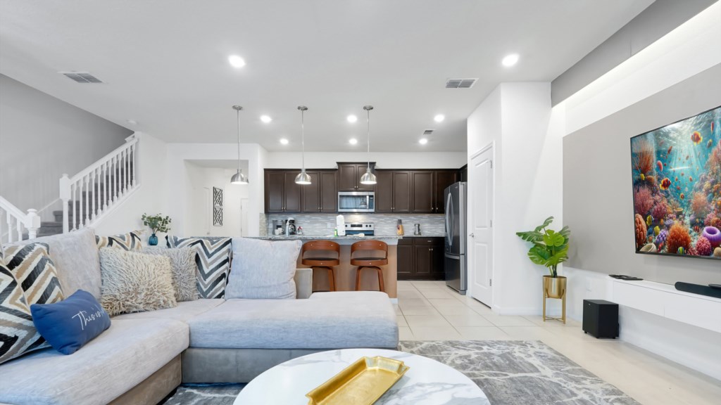 Open living room with sectional sofa & Large Smart TV
