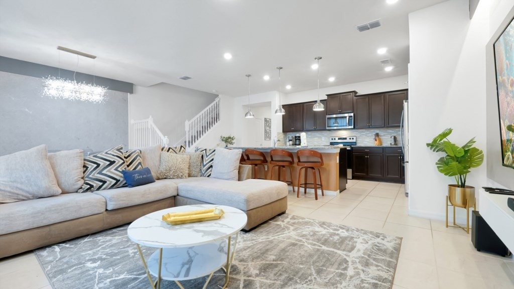 Upscale living & dining spaces – modern kitchen, open living room, and upstairs lounge with TV.