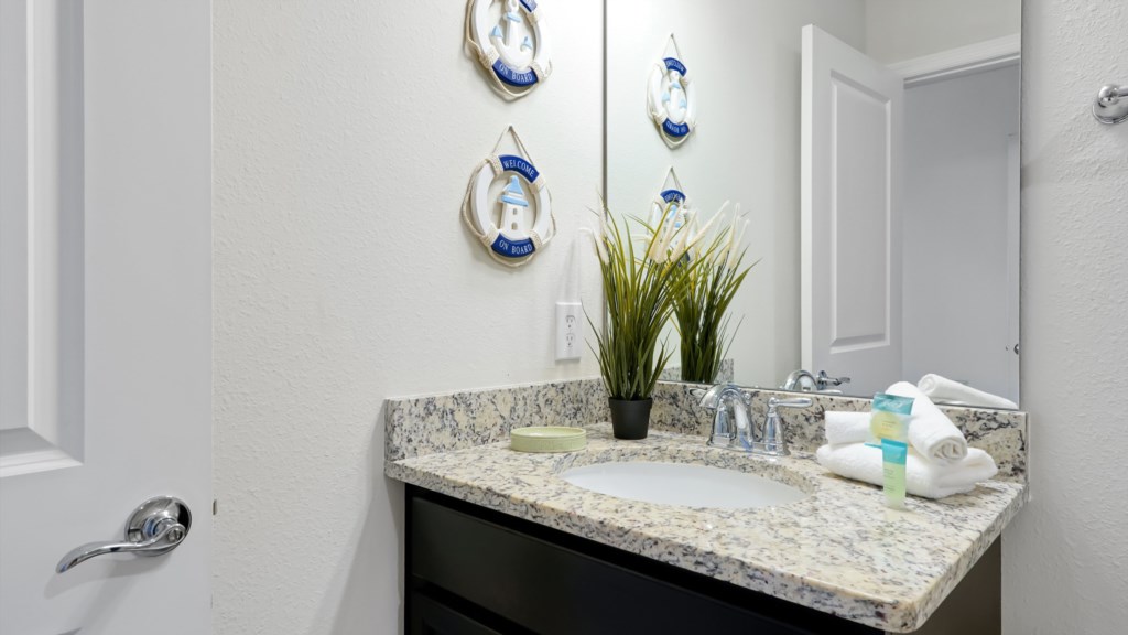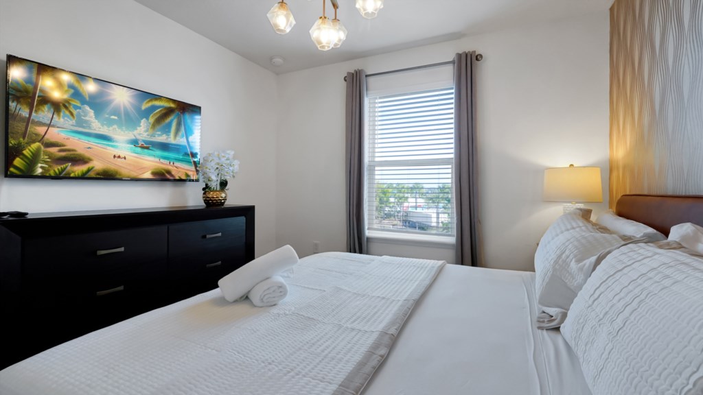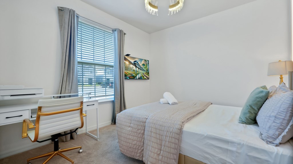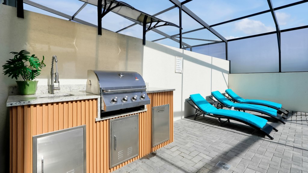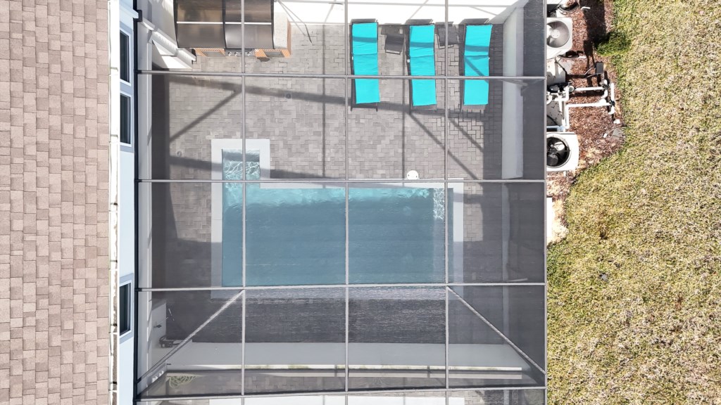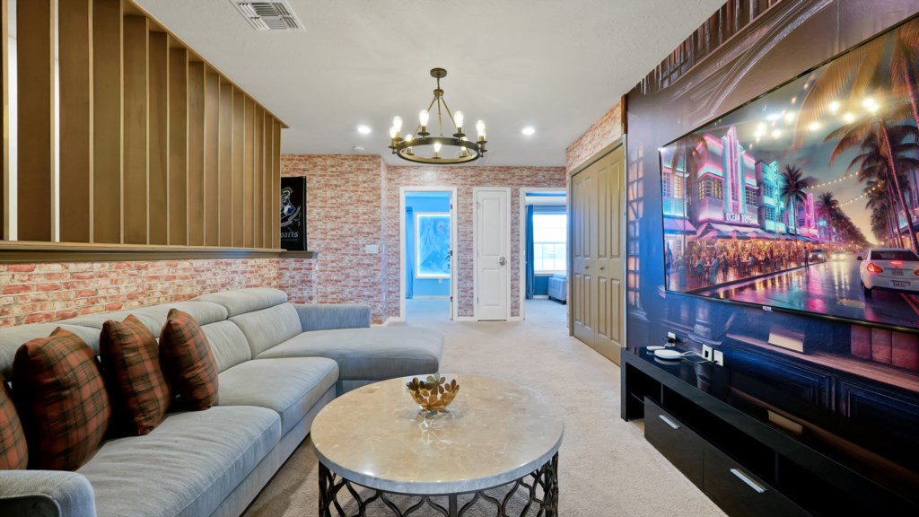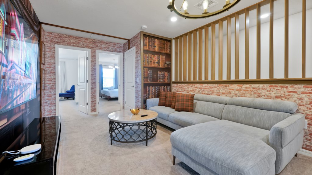 Upstairs, a secondary living area with couch and TV is perfect for movie nights, kids’ downtime, or extra gathering space. Outdoors, enjoy a private screened pool, covered lanai, alfresco dining, sun loungers, and a BBQ grill included. A half bathroom off the pool area adds convenience for all guests.
