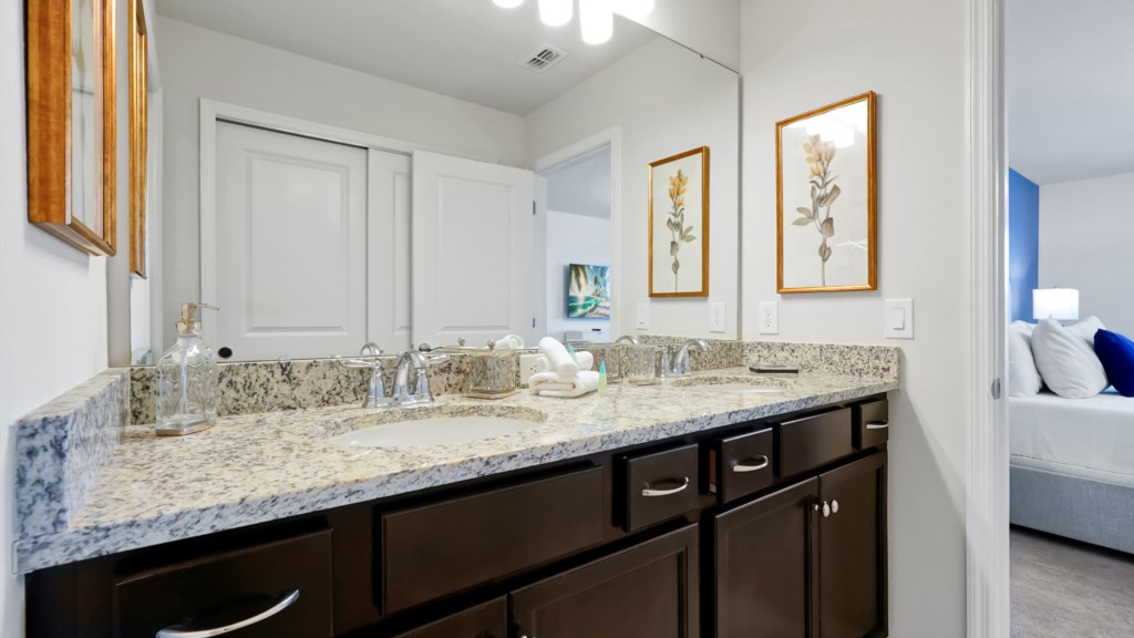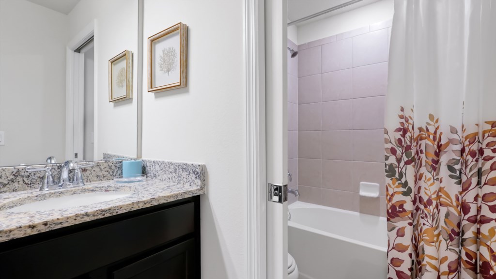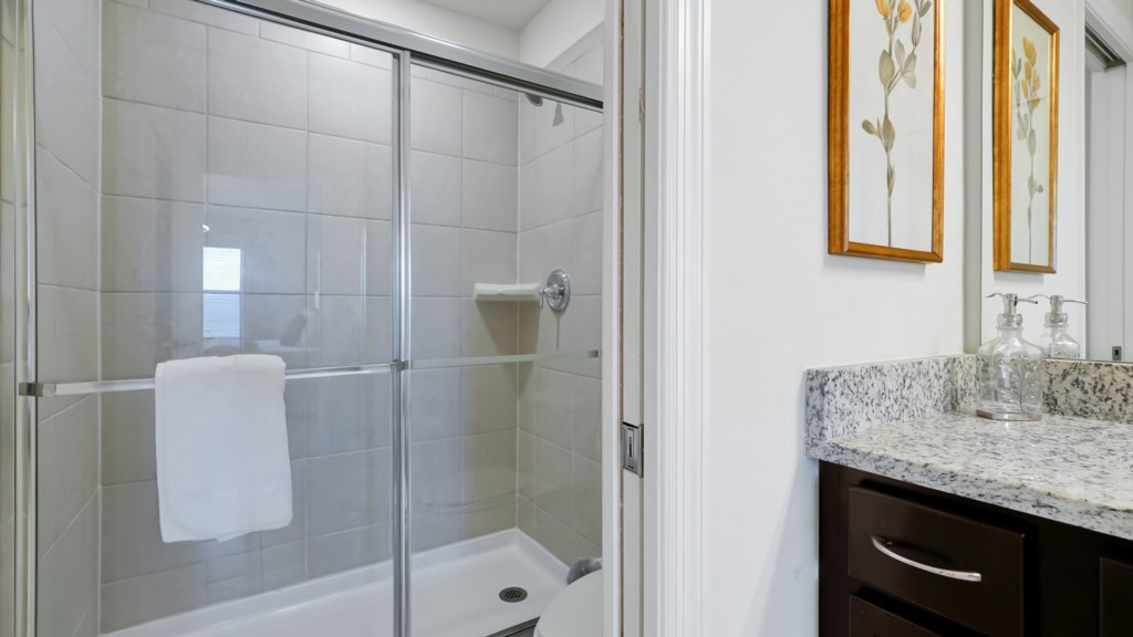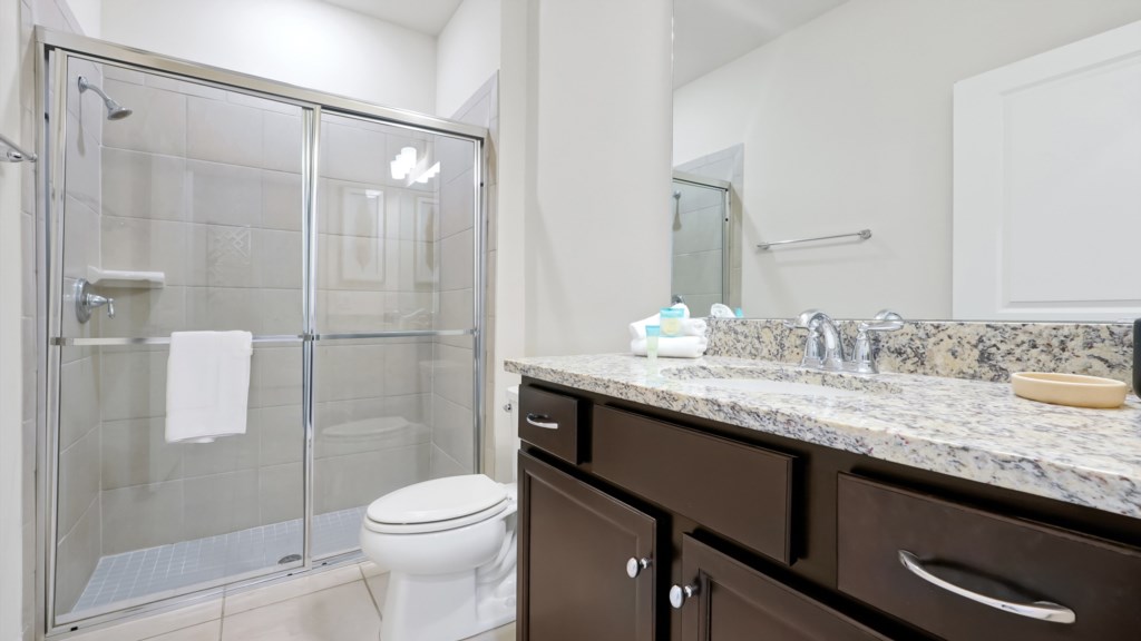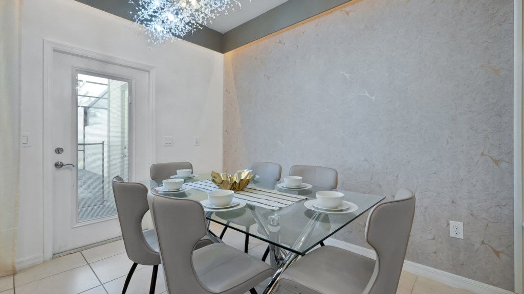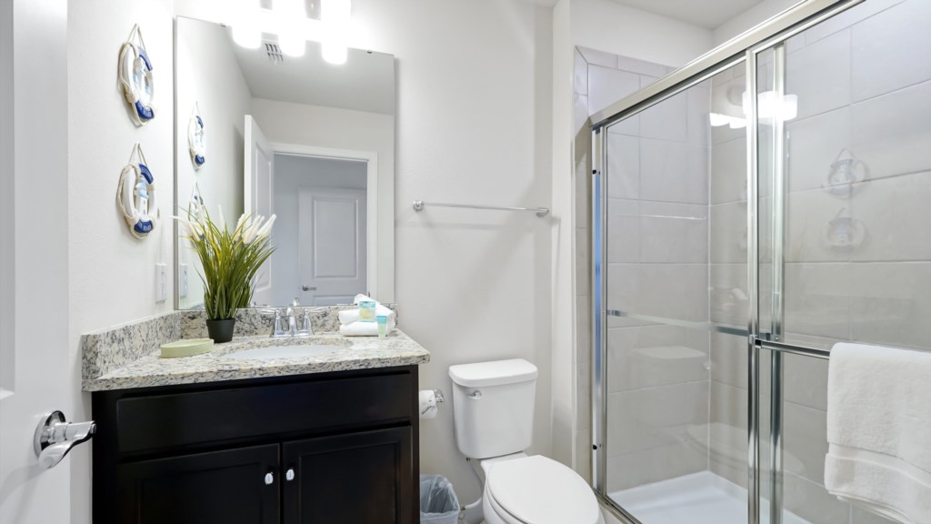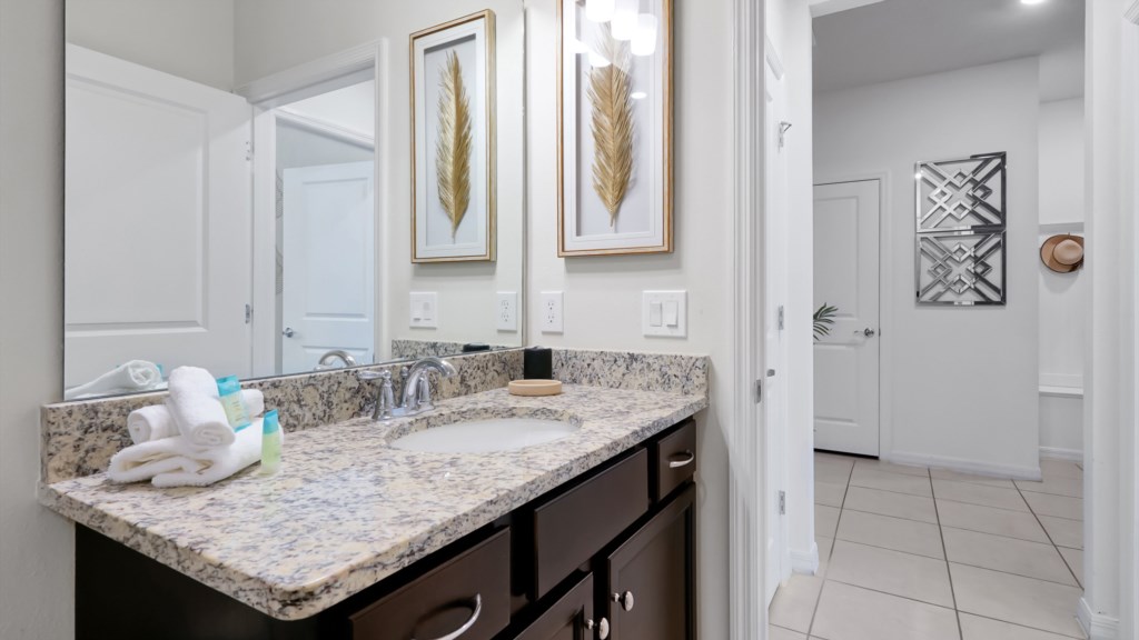 Upstairs, a secondary living area with couch and TV is perfect for movie nights, kids’ downtime, or extra gathering space. Outdoors, enjoy a private screened pool, covered lanai, alfresco dining, sun loungers, and a BBQ grill included. A half bathroom off the pool area adds convenience for all guests.