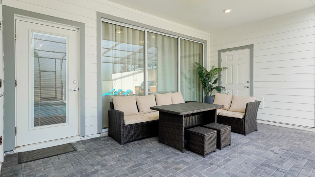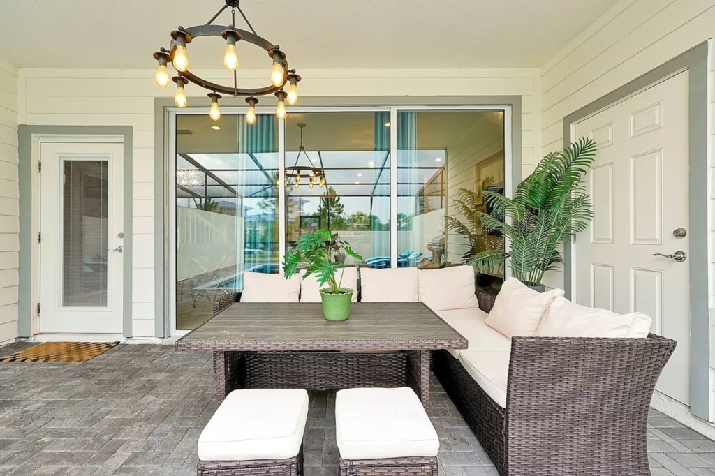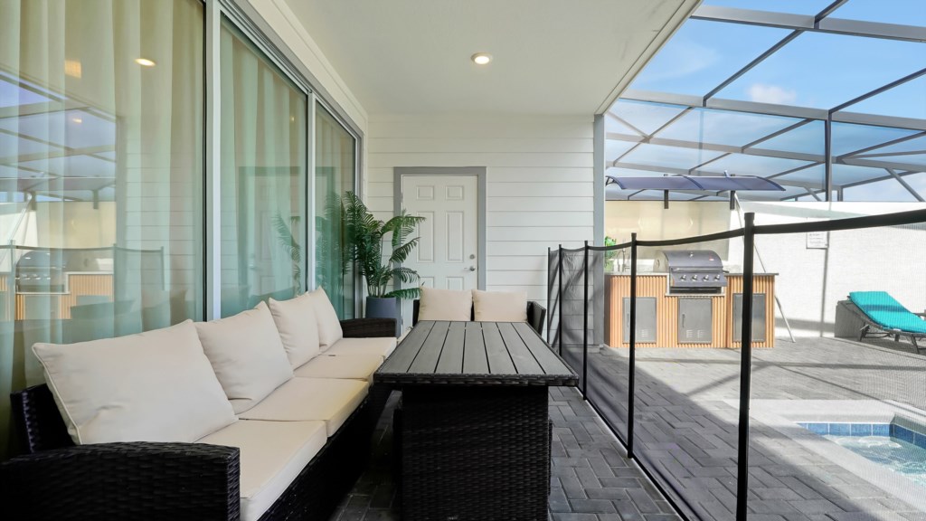 Covered lanai with seating & alfresco dining